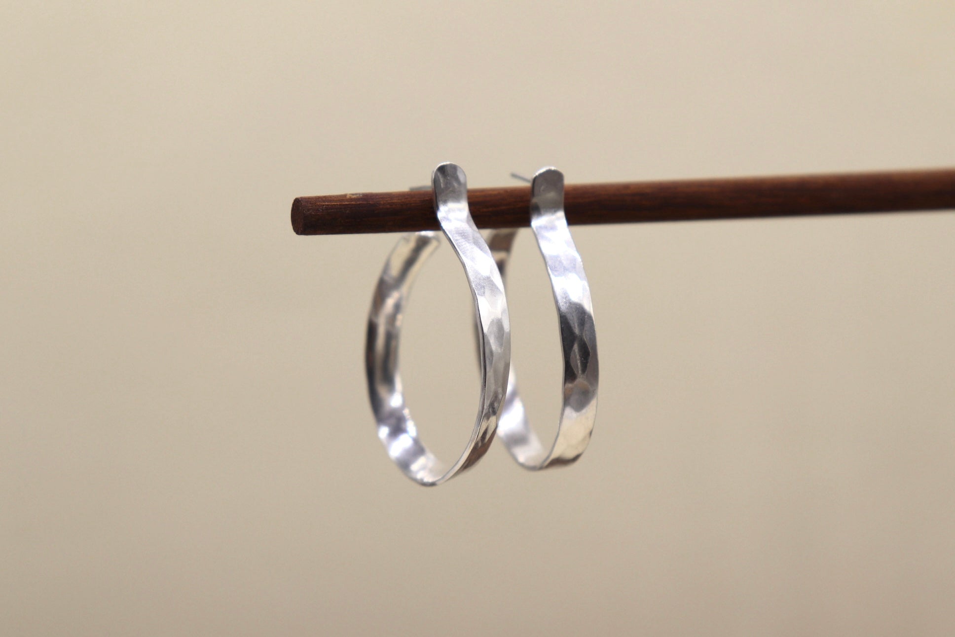 Recycled sterling silver hammered hoops. Secure stud post with silicone backing. Each pair is handcrafted with subtle texture and shine — an easy, everyday hoop